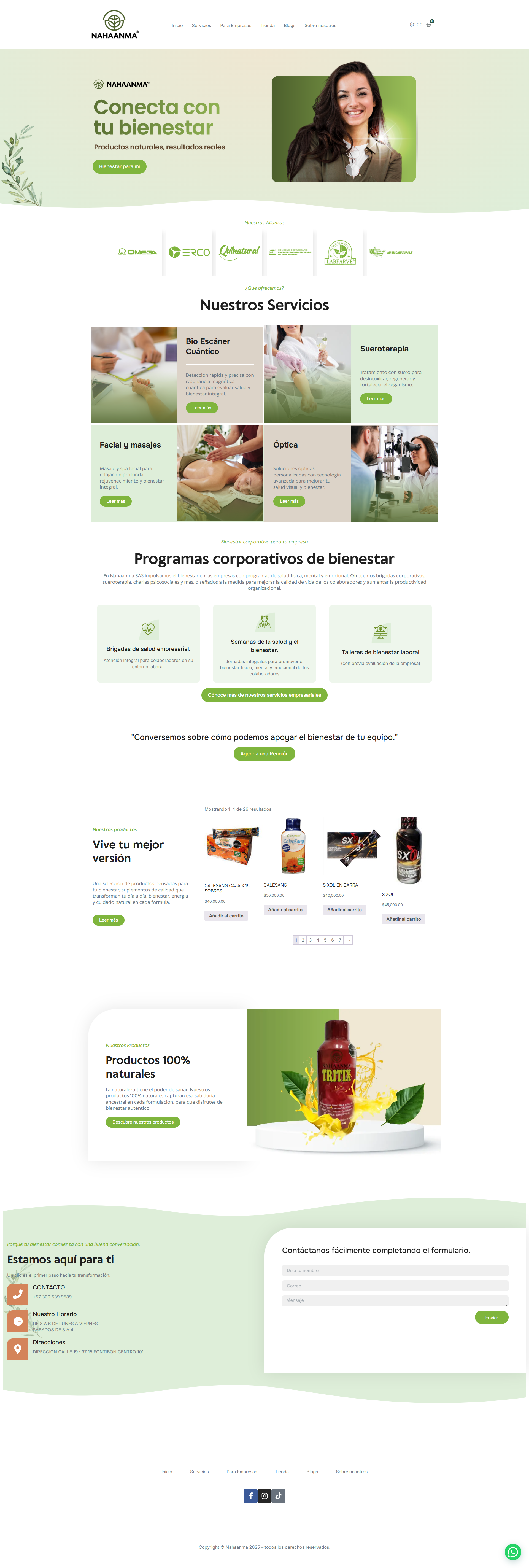 Nahaanma es una plataforma digital dedicada a productos naturales y bienestar integral (física, mental y emocional), que ofrece servicios como brigadas corporativas, sueroterapia y productos enfocados en salud natural. El sitio tiene como objetivo informar, conectar con su audiencia interesada en salud natural y presentar sus servicios de manera clara y profesional.